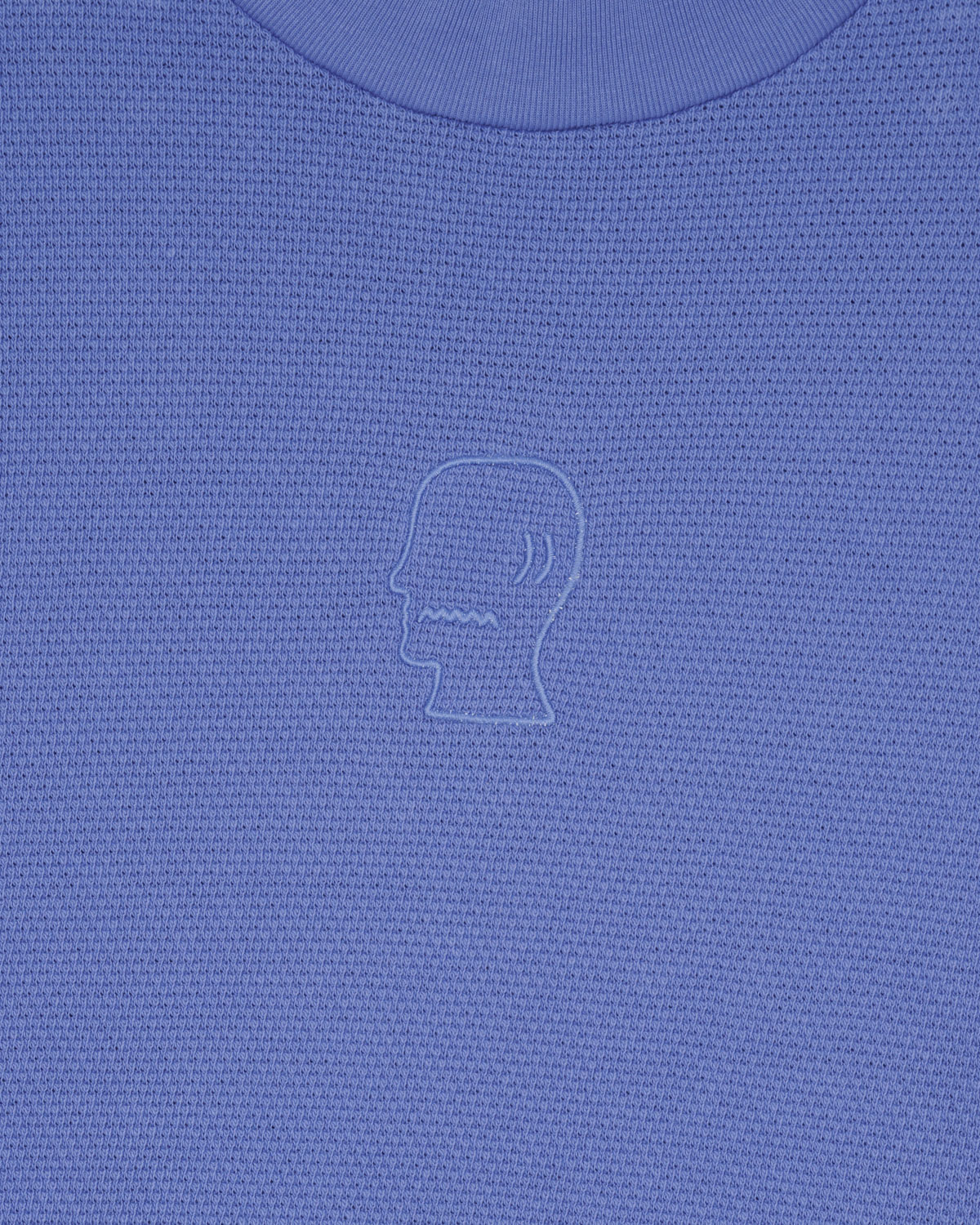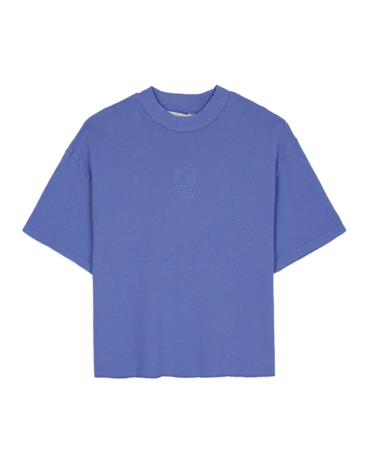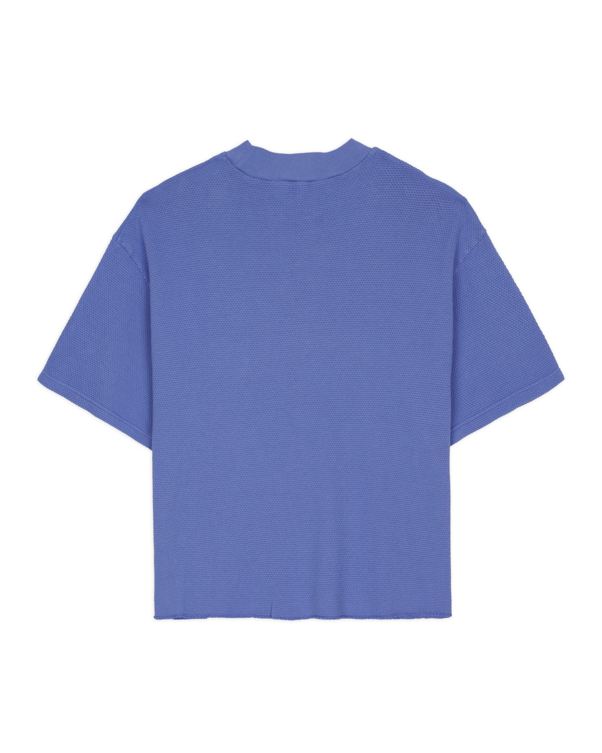 Presenta una textura holgada y un corte cuadrado y estructurado, con un logo bordado a tono en el pecho y un dobladillo inferior sin rematar.